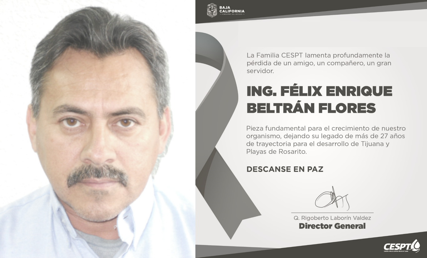 La Comisión Estatal de Servicios Públicos de Tijuana (CESPT), por encargo de su director general Rigoberto Laborín Valdez, informa del lamentable fallecimiento del ingeniero Félix Enrique Beltrán Flores, a la edad de 56 años.