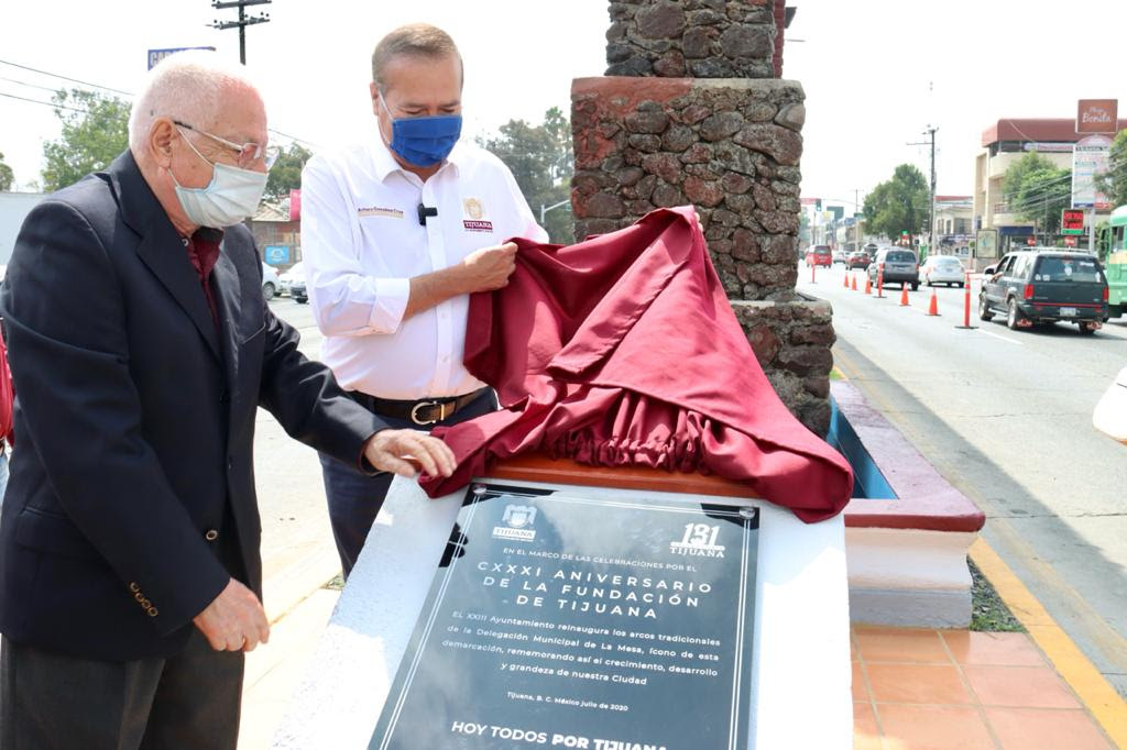 El presidente municipal, Arturo González Cruz, develó una placa conmemorativa por la rehabilitación de los emblemáticos Arcos, ubicados en el bulevar Díaz Ordaz de la Delegación La Mesa, dentro del marco de los festejos por el 131 Aniversario de Tijuana.