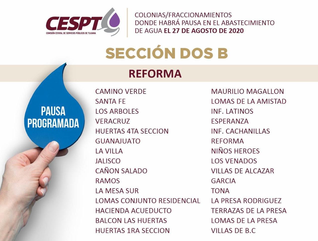 Con el objetivo de dar seguimiento a la publicación de las listas de colonias que forman parte del programa de “PAUSA” de la Comisión Estatal de Servicios Públicos de Tijuana (CESPT), el organismo brinda la información respecto a las colonias que este jueves 27 de agosto serán parte de este programa y que por lo tanto tendrán una “pausa” en el suministro de agua potable.