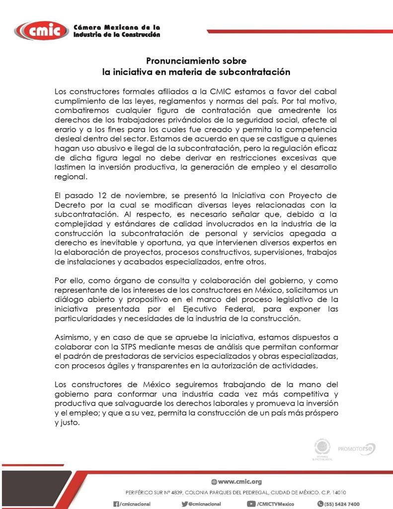 Luego de que el Gobierno Federal emitió una iniciativa para modificar diversas leyes relacionadas con la subcontratación, la CMIC Nacional señaló que debido a la complejidad y estándares de calidad involucrados en la industria de la construcción, la subcontratación de personal y servicios apegada a derecho es inevitable y oportuna