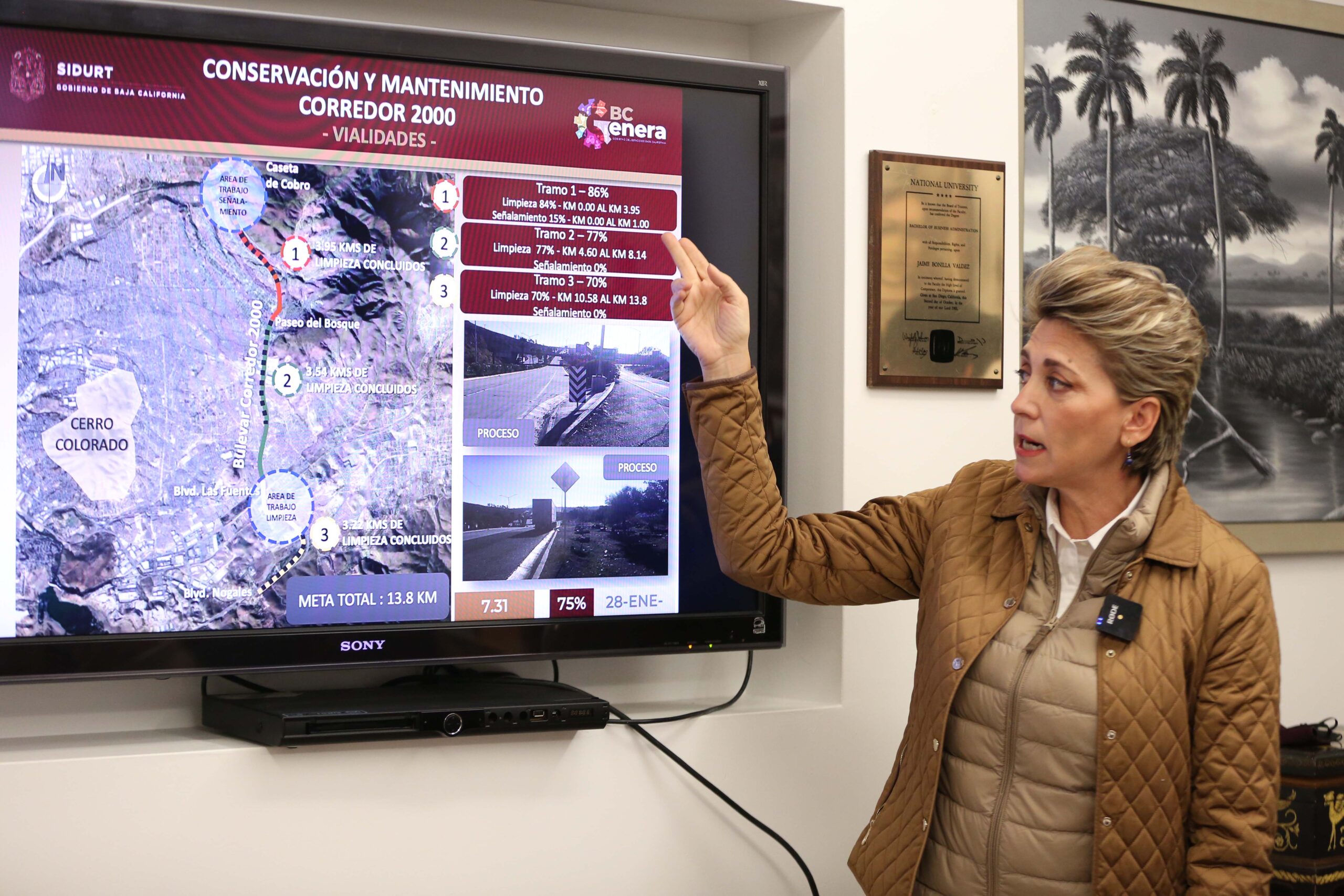 La secretaria agregó que en proceso de licitación, en Tijuana, se encuentran: la  modernización de crucero carretero libre Tecate-Tijuana y Bulevar Nogales; Modernización de crucero Bulevar 2000 con Bulevar Nogales; Rehabilitación de carpeta asfáltica del  estacionamiento de Hospital General; demolición de área afectada en viviendas de la Col. Sánchez Taboada, limpieza y retiro de escombro; construcción de muro de contención en calle Juan García en la colonia Libertad; trabajos de conservación rutinaria y mantenimiento en Alberto Limón Padilla; pavimentación en acceso a Col. Florido y Rehabilitación del bulevar García tramo de Corredor 2000 a Paseo del Prado.