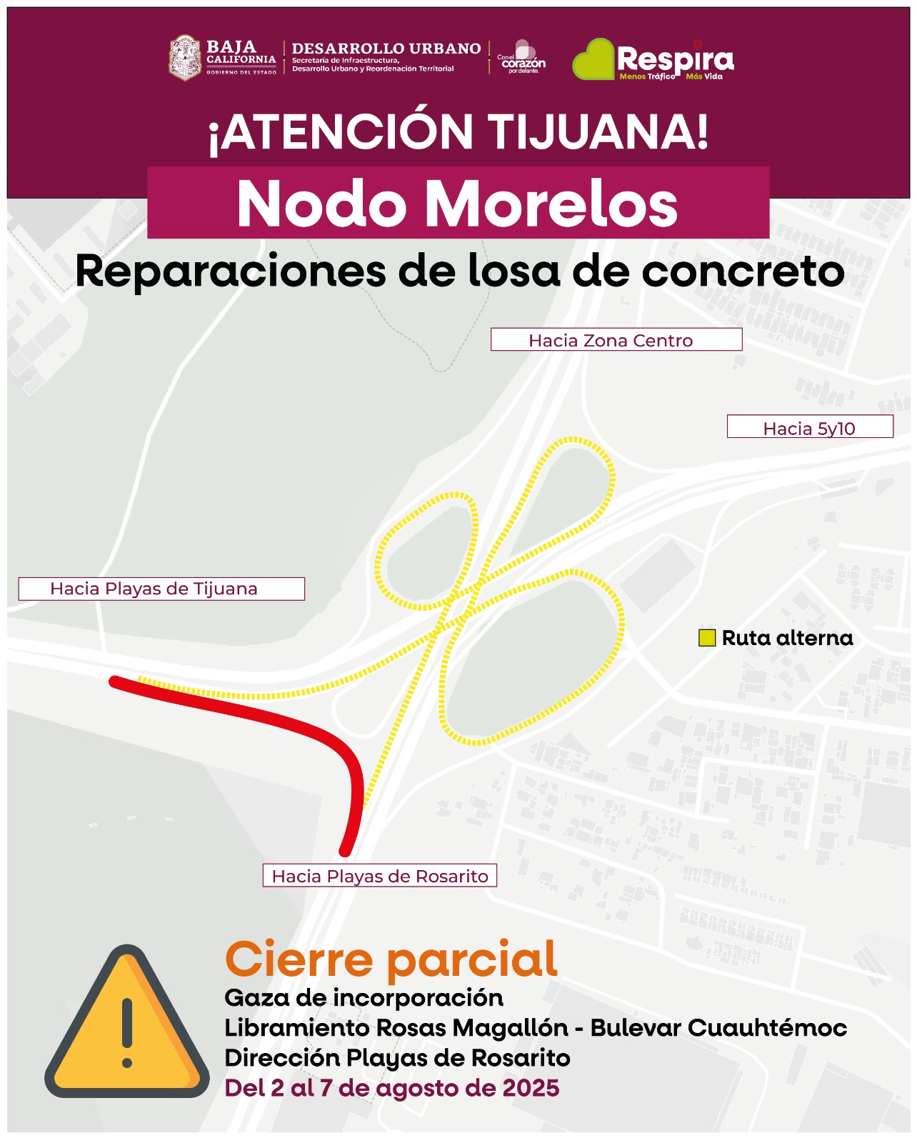 En cuanto a la ruta alterna, Espinoza Jaramillo señaló que las y los automovilistas deberán hacer uso de las tres gazas del nodo para incorporarse al bulevar Cuauhtémoc Sur en dirección a la zona centro, para después utilizar la gaza de incorporación al Libramiento Rosas Magallón en dirección a Playas de Tijuana y después dirigirse hacia la gaza de incorporación al bulevar Cuauhtémoc Sur ahora en dirección a Playas de Rosarito.
