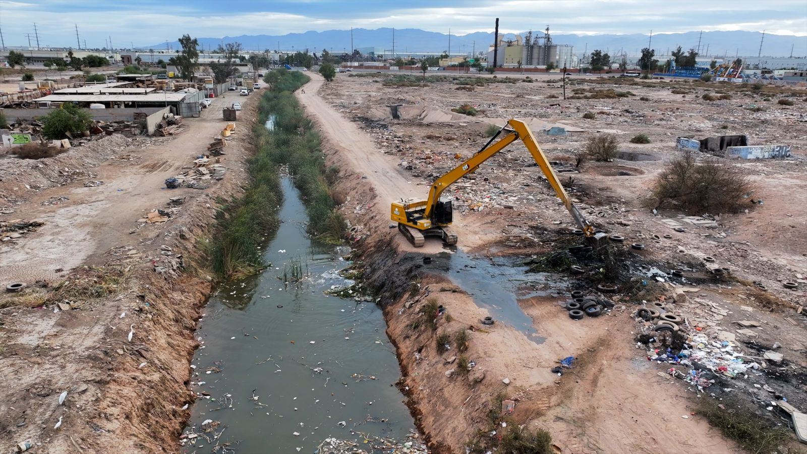 La Comisión Estatal de Servicios Públicos de Mexicali (CESPM) mantiene su compromiso con el saneamiento de la ciudad y sus zonas industriales, al continuar con labores de limpieza y mantenimiento como es el caso del Dren México, ubicado en el Parque Industrial Nelson, sobre el bulevar Venustiano Carranza.