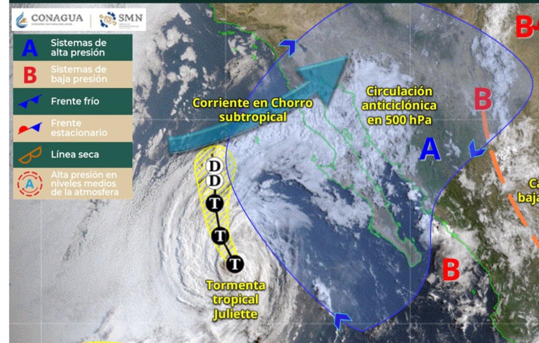 Salvador Cervantes Hernández, coordinador estatal de Protección Civil, puntualizó que la tormenta tropical Juliette no tiene trayectoria hacia Baja California ni generará efectos directos en la entidad.