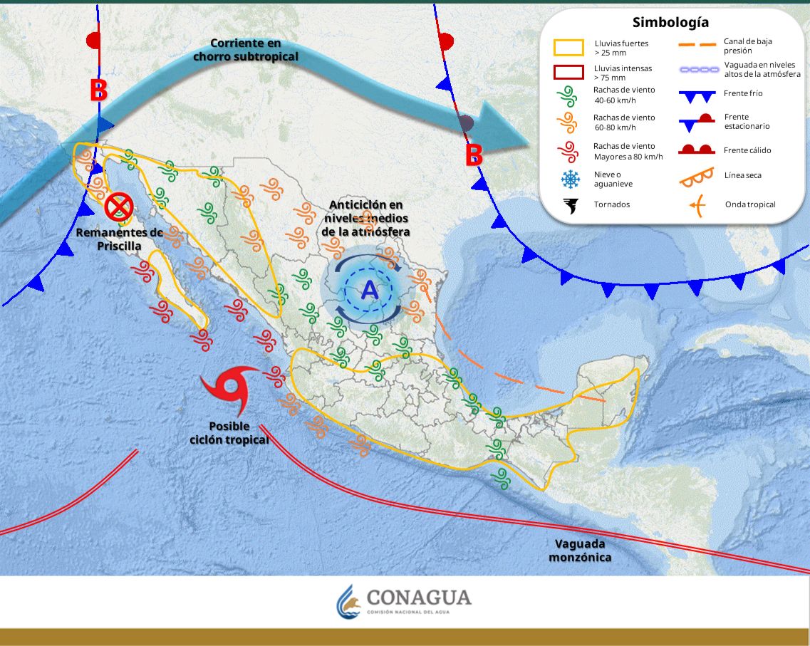 Por otro lado, el coordinador estatal informó que se espera que la tormenta tropical Priscilla se degrade frente a las costas de Baja California Sur, aunque sus efectos podrían seguir aportando humedad en Baja California.