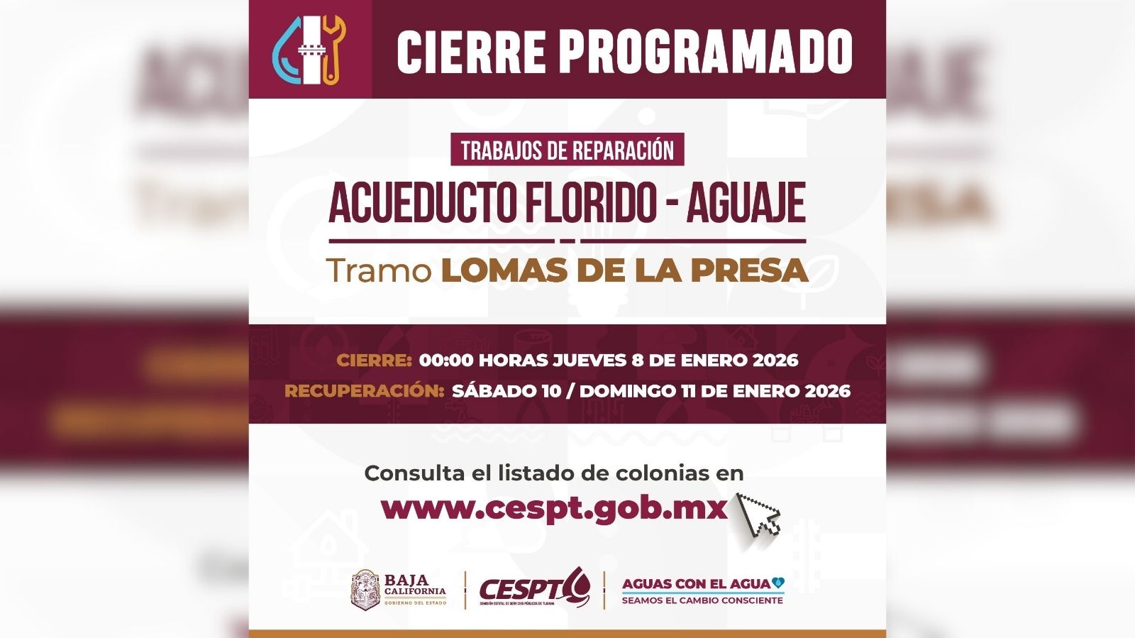 La Comisión Estatal de Servicios Públicos de Tijuana (CESPT) informa que el jueves 8 de enero, a partir de las 00:00 horas, se suspenderá el suministro de agua potable en 691 colonias de Tijuana y Playas de Rosarito, debido al inicio de trabajos de interconexión en el Acueducto Florido-Aguaje, en el tramo ubicado en la colonia Lomas de la Presa.